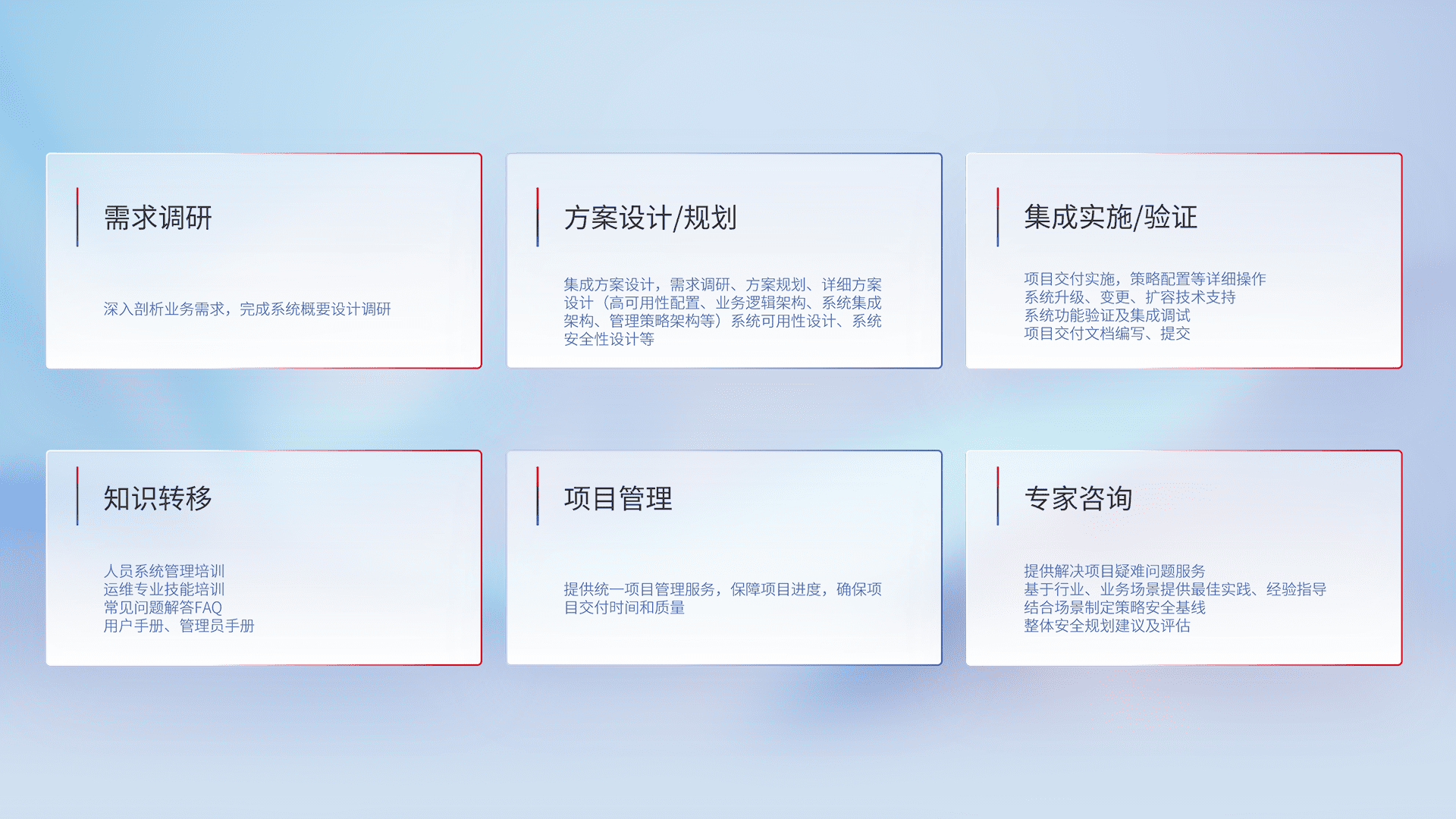 针对客户行业特性,,,将宏观的安全战略和需求,,通过专业的交付服务,,,,实现项目落地,,,,为客户提供标准规范的集成交付服务。。